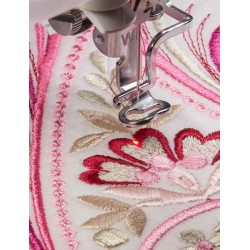 Ce pied de broderie lumineux à LED unique permet de visualiser instantanément la chute de l'aiguille sur le tissu. Très pratique pour le positionnement du centre du motif dans le cadre à broder, idéal pour faciliter le raccordement des motifs ou pour rependre la broderie à un endroit précis lors d'une éventuelle interruption. Lorsque le pied à broder lumineux est activé, la hauteur du pied est automatiquement réglée en fonction de l'épaisseur du tissu.