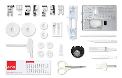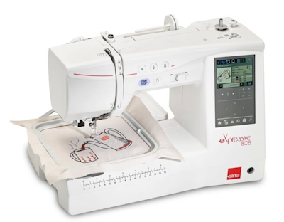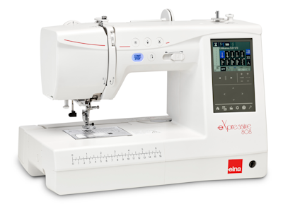 La nouvelle machine Elna eXpressive 808 combine tous les avantages d'une machine à coudre avec ses 300 points de couture et de décoration et d'une machine à broder proposant un champ de broderie maximum de 140 x 140 mm.